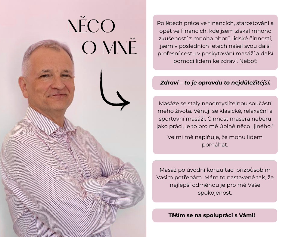 Mohu nabídnout masáž celého těla v délce trvání 60 nebo 90 minut (dolní končetiny, záda, šíje, horní končetiny). Také Vám mohu nabídnout masáž v délce trvání 120 minut.
